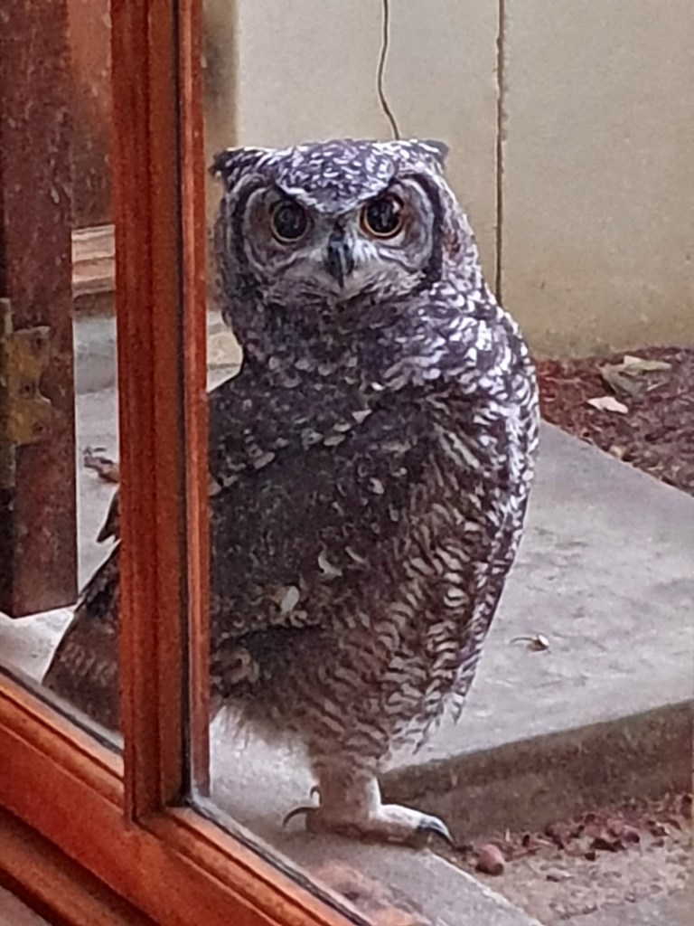 Spotted Eagle Owl on window sill