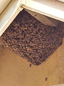 Every now and then a swarm of bees will rest for a while in an oak tree, a vine or under the eaves before moving on.